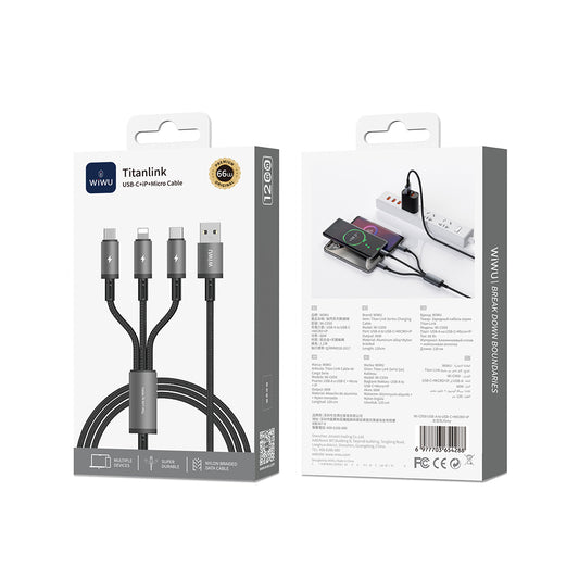Wiwu Wi-C059 Titanlink Serisi 3in1 USB-A to Lightning – Type-C – Micro Örgülü Şarj ve Data Kablosu 66W 1.2m