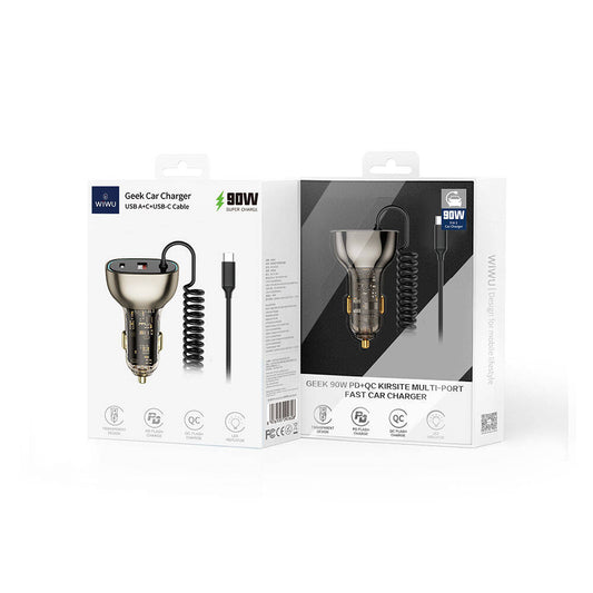 Wiwu Wi-QC016 Geek Serisi Type-C + Type-C Kablolu + USB-A Hızlı Şarj Özellikli Transparan Tasarımlı Araç Şarj Aleti 90W